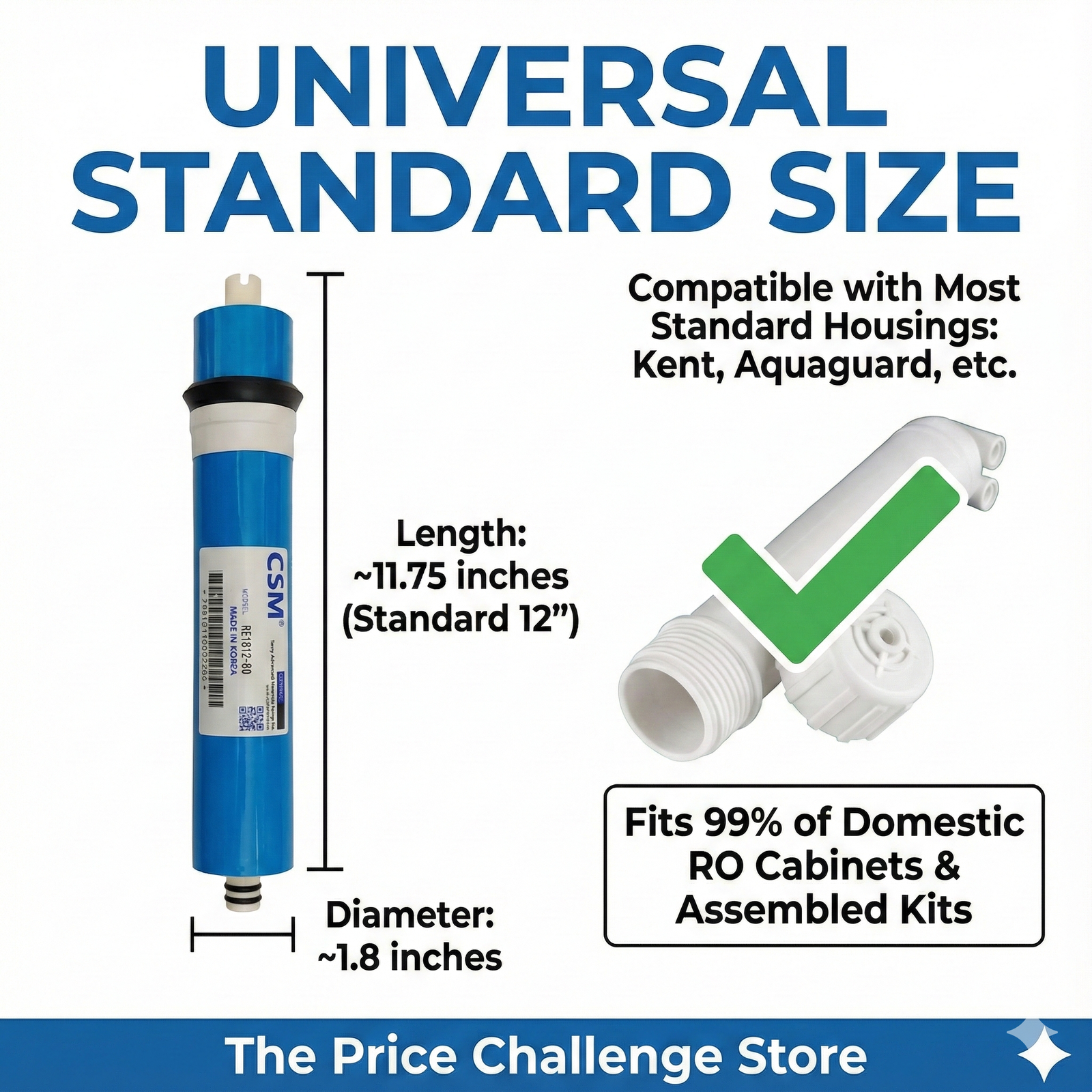 • Universal Compatibility: This 1812-size element fits standard membrane housings used in 99% of domestic RO purifiers (Kent, Aquaguard, Assembled units).