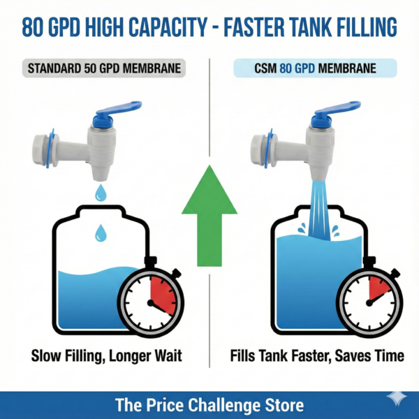 • Flow Rate: 80 Gallons Per Day (approx 12-15 Liters/Hour)