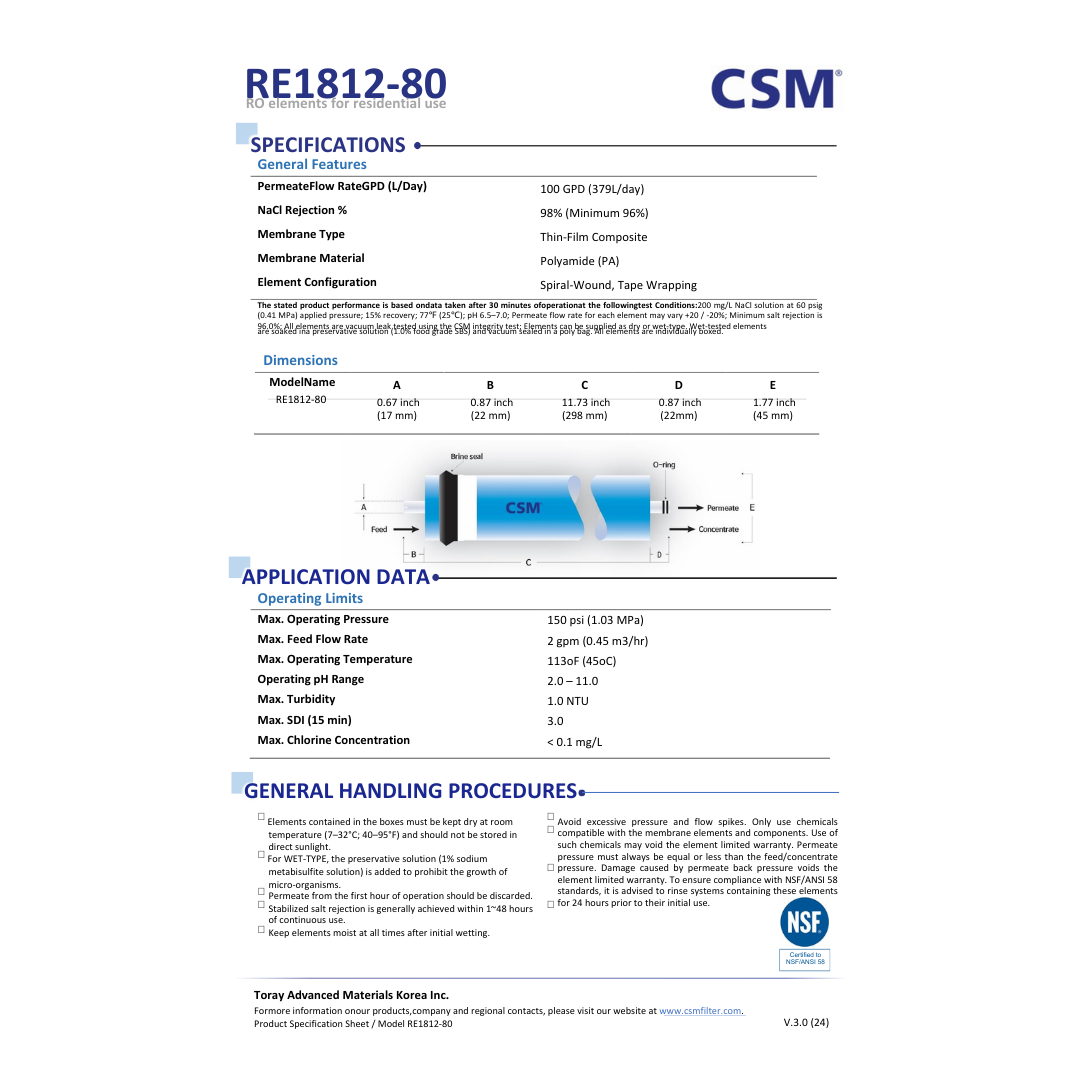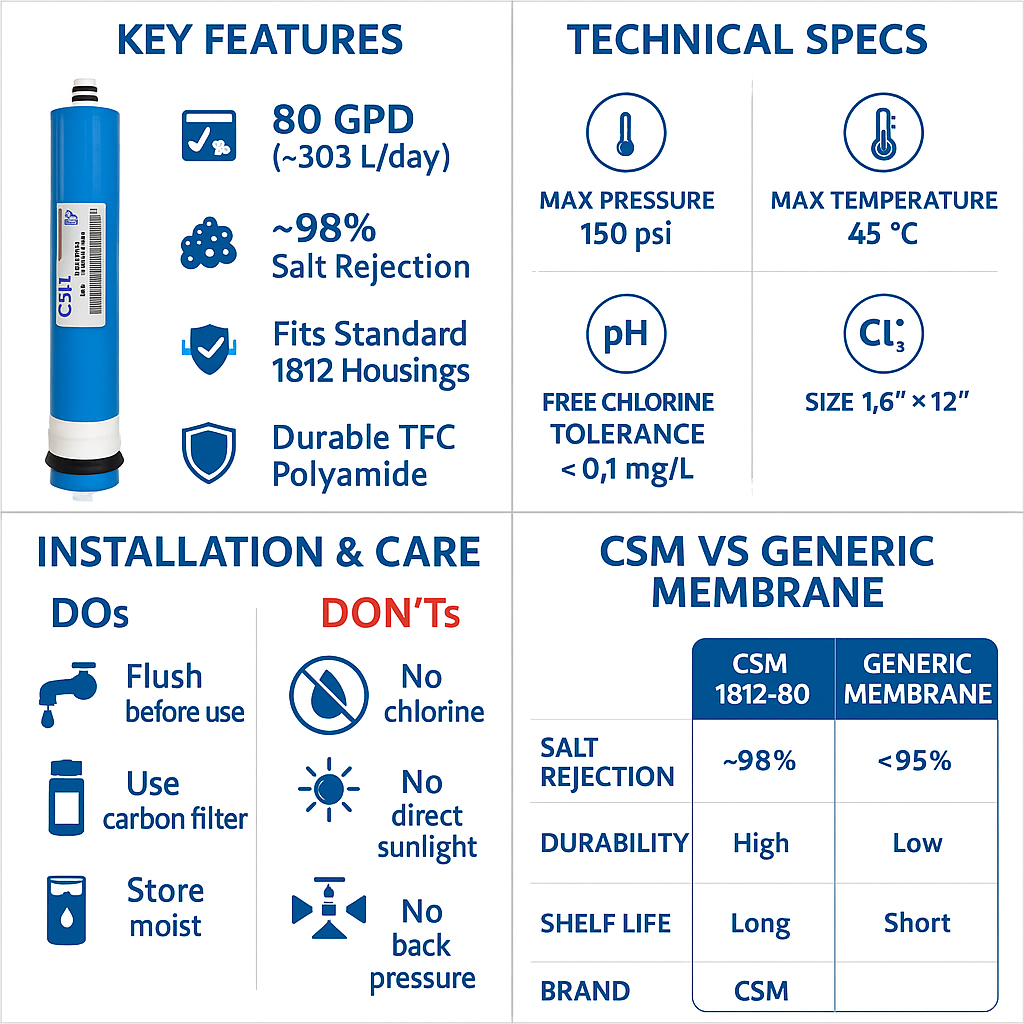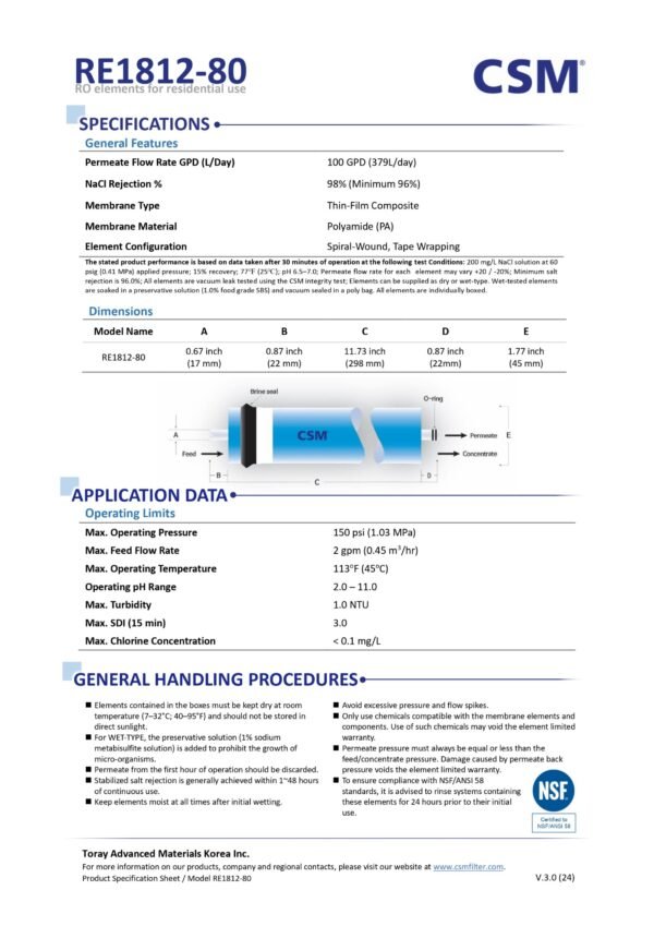 Original CSM RO Membrane 80 GPD (RE1812-80) – Works Upto 3000 TDS | High Rejection Genuine Filter